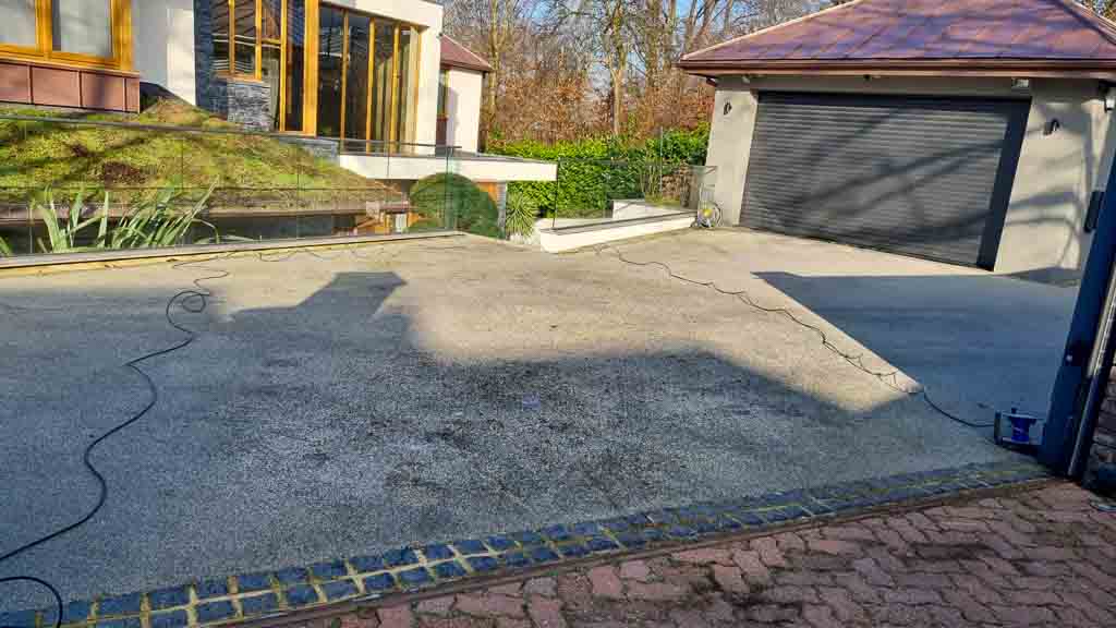 Rather than simply patching the affected areas, the worn-out section was viewed as an opportunity to create a distinctive feature. A sweeping arc was delineated, starting from the property entrance and extending diagonally across the driveway to the garage entrance.